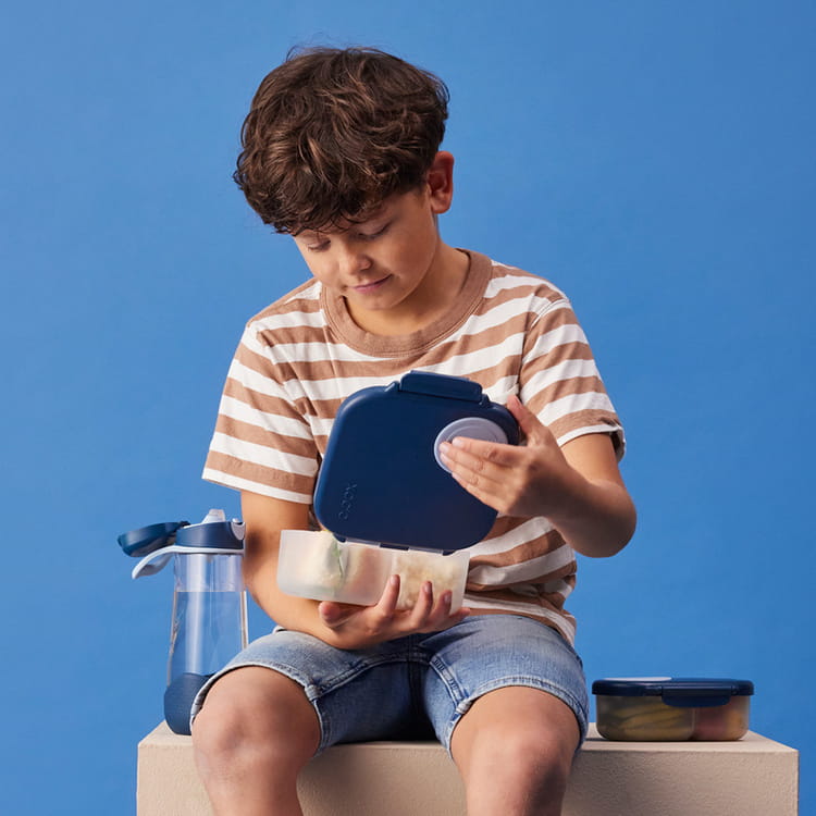 Mini lunchbox b.box dla dzieci ma dwie szczelne przegródki w tym jedną flex przeznaczoną na całe owoce. W przegrody te można włożyć także takie przekąski jak jogurt, humus, gęsty przecier, dip, owoce i warzywa. Obok znajduje się przegroda bez uszczelki z przesuwanym i wyjmowanym elementem dzielącym ułatwiającym dopasowanie do potrzeb. Lunchbox b.box ma kształt poręcznej walizeczki w wygodnym uchwytem i prostym w obsłudze zatrzaskiem.