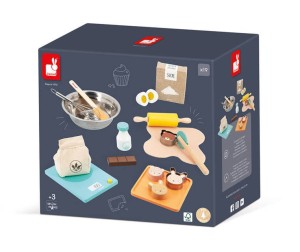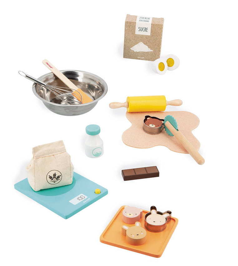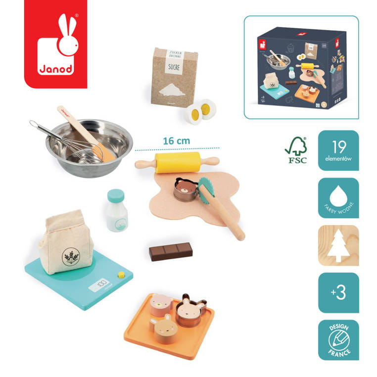Drewniany zestaw Warsztat cukiernika francuskiej marki JANOD składa się z 19 elementów i sprawi mnóstwo radości każdemu dziecku. Pozwoli mu bezpiecznie uczestniczyć razem z rodzicem w codziennych kuchennych czynnościach i rozwijać pasję gotowania. W skład zestawu wchodzą: mąka w lnianym woreczku, karton cukru, butelka mleka, jajko (2 części z żółtkiem-rzepem do ich łączenia), pasek czekolady, rozwałkowane ciasto, 4 ciasteczka (2 misie i 2 zajączki), drewniana waga kuchenna, metalowa miska i rózga do wyrabiania ciasta, szpatułka, wałek, wykrawaczka, tacka do serwowania. Większość elementów wykonana została z drewna FSC (pozyskanego z lasów zarządzanych w zrównoważony sposób) i pomalowana bezpiecznymi dla dzieci farbami. Stanowią świetne uzupełnienie każdej dziecięcej kuchni.