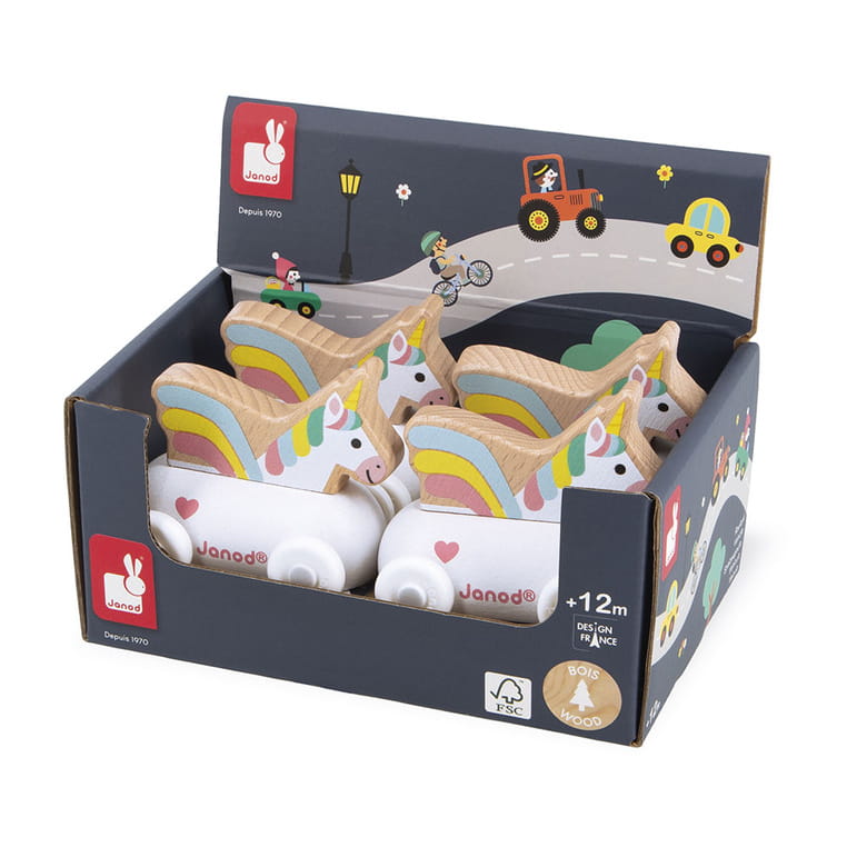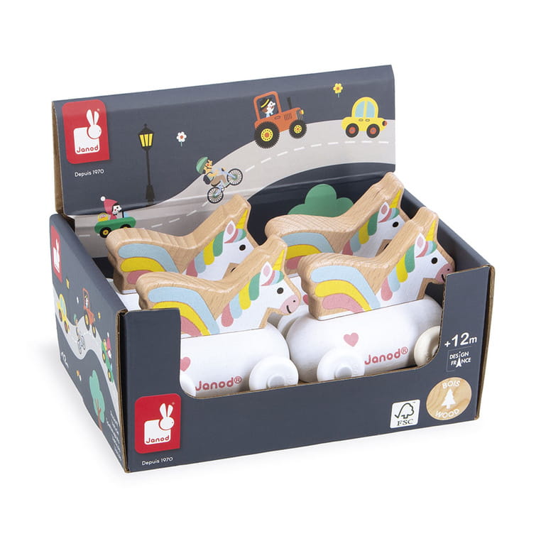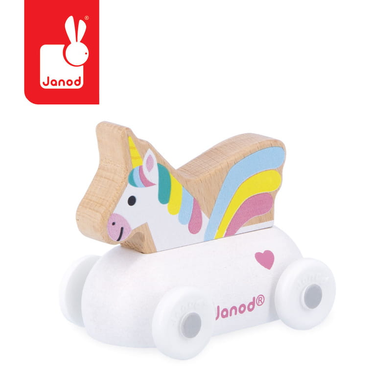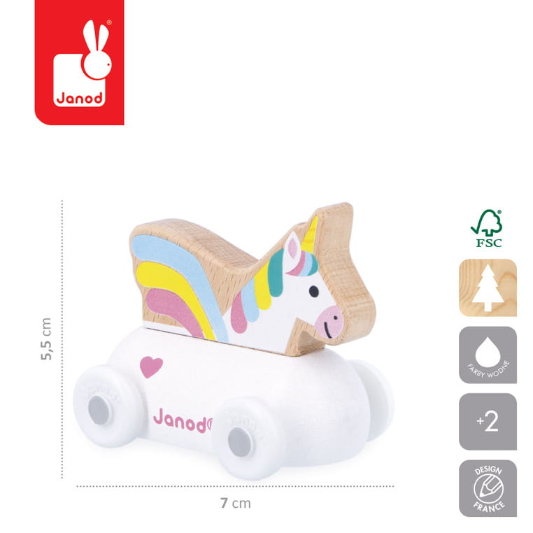 Pojazd z jednorożcem z serii Cross Roads francuskiej marki JANOD to doskonałe uzupełnienie maty-dywanu do zabawy z drogą Zaczarowane królestwo z tej samej kolekcji. Pojazd wykonany jest z drewna, posiada poręczne kształty dopasowane do małych rączek, biały kolor, a dzięki kółkom łatwo porusza się po różnych powierzchniach. W środku znajduje się jednorożec z tęczową grzywą, co zachęca malucha do snucia własnych historii i kreatywnej zabawy.