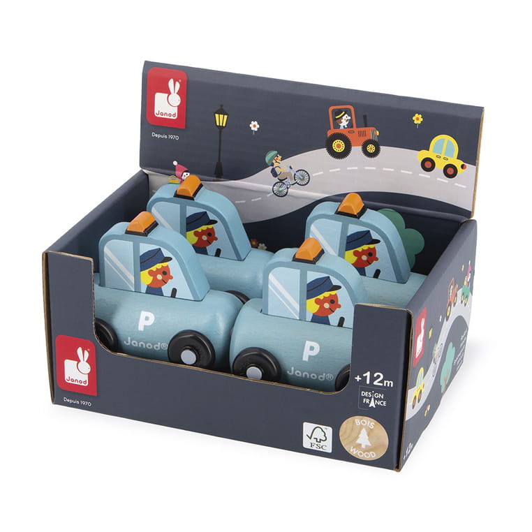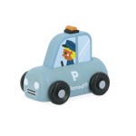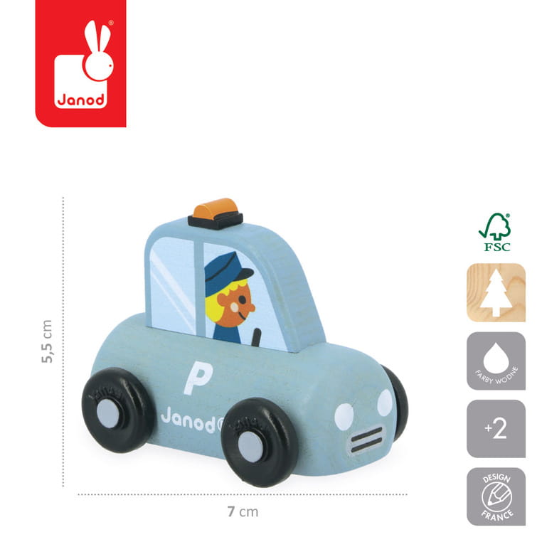Radiowóz z serii Cross Roads francuskiej marki JANOD to doskonałe uzupełnienie maty-dywanu do zabawy z drogą Miasto z tej samej kolekcji. Pojazd wykonany jest z drewna, posiada poręczne kształty dopasowane do małych rączek, jasnoniebieski kolor, a dzięki kółkom łatwo porusza się po różnych powierzchniach. W środku znajduje się uśmiechnięty policjant, co zachęca malucha do snucia własnych historii i kreatywnej zabawy.