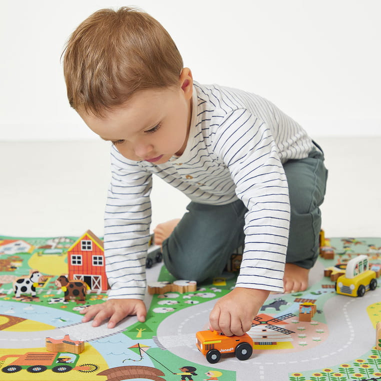 Traktor z serii Cross Roads francuskiej marki JANOD to doskonałe uzupełnienie maty-dywanu do zabawy z drogą Wieś z tej samej kolekcji. Pojazd wykonany jest z drewna, posiada poręczne kształty dopasowane do małych rączek, pomarańczowy kolor, a dzięki kółkom łatwo porusza się po różnych powierzchniach. W środku znajduje się uśmiechnięta rolniczka, co zachęca malucha do snucia własnych historii i kreatywnej zabawy.