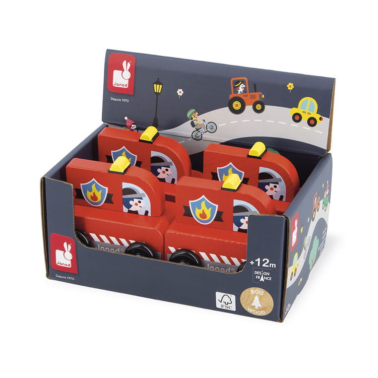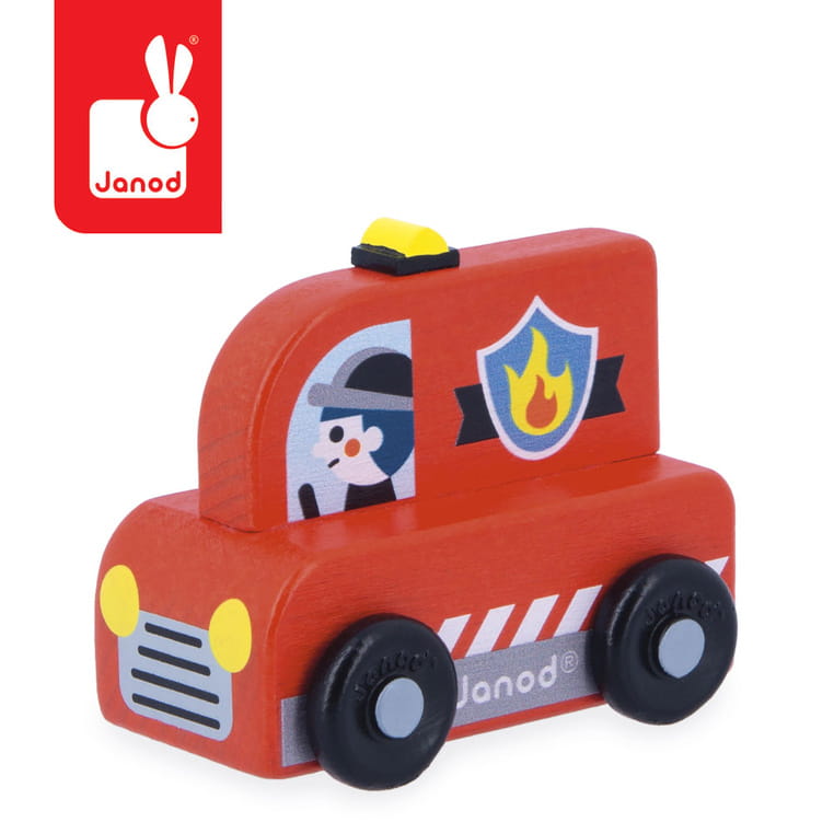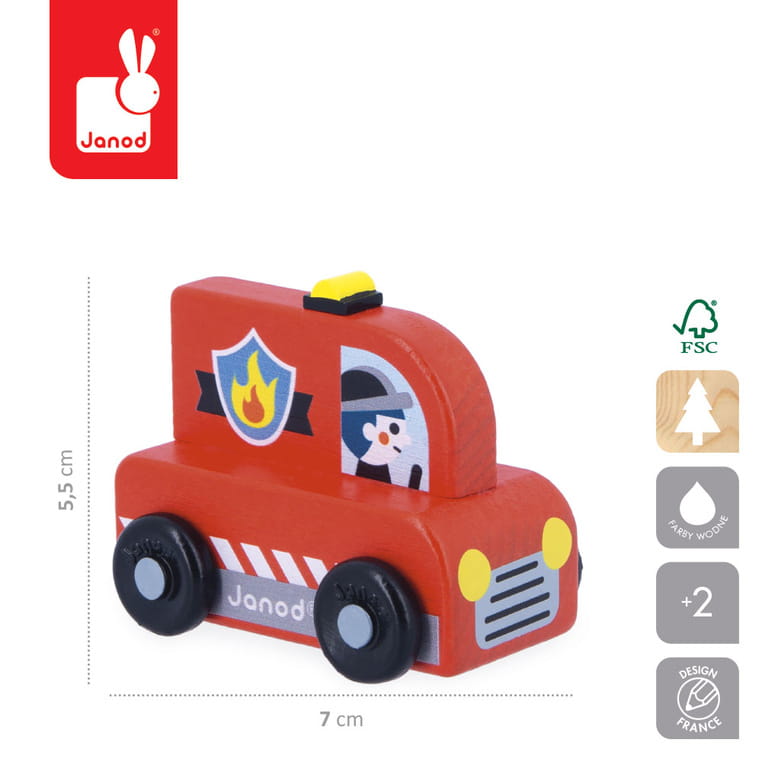 Wóz strażacki z serii Cross Roads francuskiej marki JANOD to doskonałe uzupełnienie maty-dywanu do zabawy z drogą Miasto z tej samej kolekcji. Pojazd wykonany jest z drewna, posiada poręczne kształty dopasowane do małych rączek, czerwony kolor, a dzięki kółkom łatwo porusza się po różnych powierzchniach. W środku znajduje się strażak, co zachęca malucha do snucia własnych historii i kreatywnej zabawy.