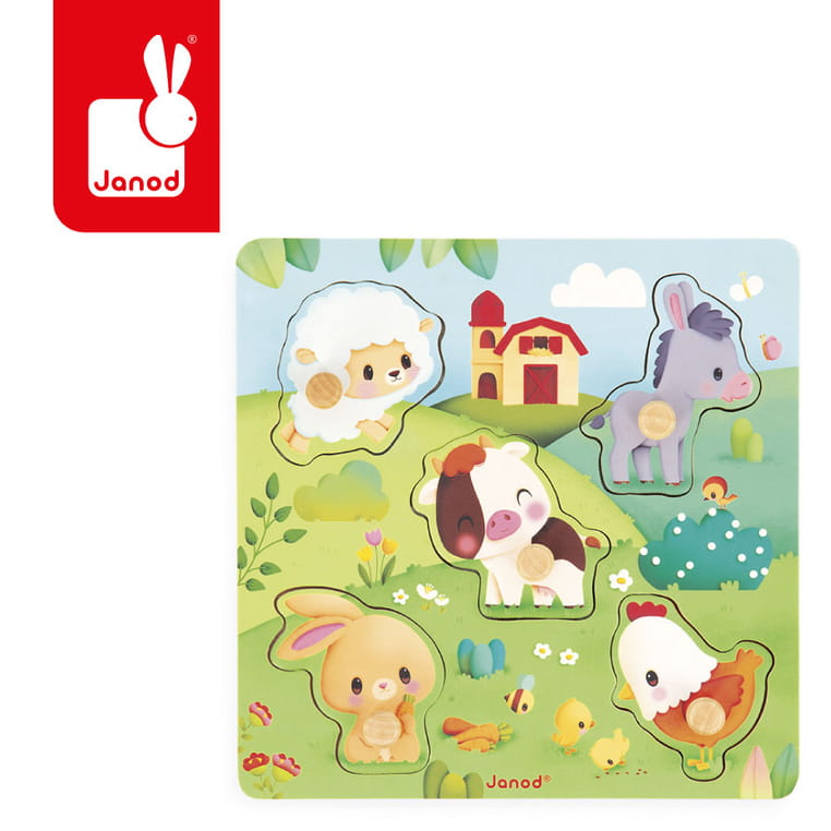 Drewniane puzzle sensoryczne z serii Farma francuskiej marki JANOD to wspaniała pierwsza układanka dla malucha. Zestaw składa się z 5 drewnianych zwierząt (kurka, osiołek, królik, krówka i owieczka) i drewnianej planszy z wgłębieniami w ich kształtach. Miejsca te wypełnione są dodatkowo teksturowanymi materiałami, imitującymi sierść czy skórę danego zwierzątka. Zadaniem dziecka jest dopasowanie każdego puzzla w odpowiednią przestrzeń. Specjalne uchwyty przy każdym z elementów ułatwiają małym rączkom zabawę. Taka układanka to idealny wstęp do prawdziwych puzzli, a kontakt z różnymi fakturami to doskonałe narzędzie empiryczne, rozwijające zmysł dotyku.