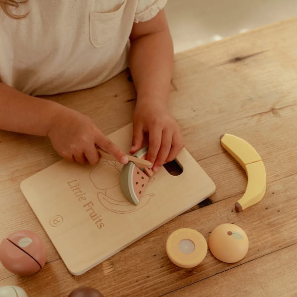 Zestaw składający się z owoców, takich jak: jabłuszko, banan, kiwi, gruszka, pomarańczka, arbuz oraz deseczka wraz z bezpiecznym, drewnianym nożykiem. Wszystko można przeciąć na pół i łatwo skleić ponownie za pomocą rzepów. Owoce idealnie sprawdzą się do nauki oraz wpajania maluchom zasad zdrowego odżywiania już od najmłodszych lat. Doskonałe uzupełnienie do naszej kuchennej serii. Dostępny również zestaw z warzywami. Świetna zabawa gwarantowana!