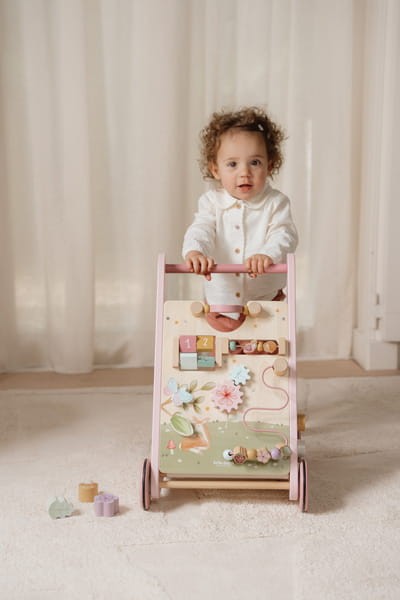 Drewniany chodzik edukacyjny Fairy Garden od Little Dutch. Pięknie ozdobiona solidna konstrukcja sprawia, że ??chodzik jest odpowiedni dla dzieci już od 12 miesiąca, które gotowe są do stawiania pierwszych kroków. Drewniany chodzik oferuje 8 ciekawych zabaw, które wspierają rozwój umiejętności motorycznych dzieci – obracanie kół zębatych, aby ważka obleciała kwiatek, nauka liczenia ze ślimakiem i jeżem, przekręcanie uwielbianego lusterka, dopasowywanie kształtów. Z tyłu chodzika znajdziemy miejsce na skarby dziecka, klocki czy zabawki, które może swobodnie przewozić. Gumowe kółka zapewniają przede wszystkim stabilność podczas pierwszych kroczków dziecka, dodatkowo, dzięki gumie, nie zarysują podłogi. Stanowi świetny pomysł na prezent i doskonałe uzupełnienie dla pozostałych zabawek z kolekcji Fairy Garden od Little Dutch.