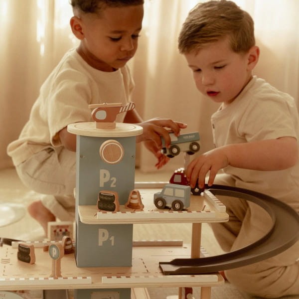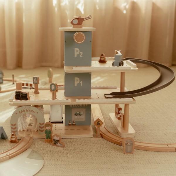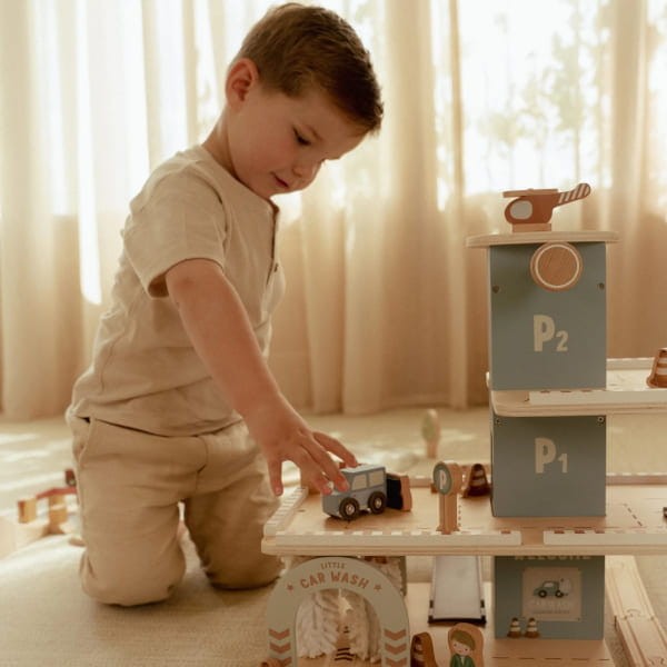 Garaż wielopoziomowy Little Dutch jest fantastycznym sposobem na długie godziny ciekawych zabaw. Łatwy w użyciu podnośnik samochodowy podnosi samochody w górę i w dół, co sprawi mnóstwo frajdy. Helikopter ma własną platformę śmigłowcową, a wszystkie samochody można parkować na każdym z poziomów parkingu. W zestawie znajdują się auta, helikopter, znaki i figurki. Garaż posiada również myjnie samochodową oraz stacja benzynową. Fantastyczna zabawa gwarantowana! Starannie wykonany z drewna z certyfikatem FSC (Forest Stewardship Council), pokryty bezpiecznymi farbami na bazie wody. Doskonały pomysł na prezent.