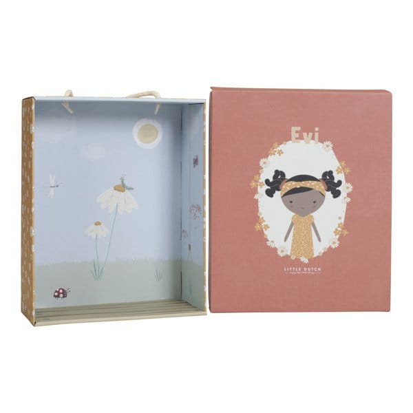 Urocza i przytulna lalka Evi wykonana z miłego i miękkiego materiału. Będzie wspaniałą towarzyszką dziecięcych zabaw i ukochaną przytulanką. Wyglądem przypomina prawdziwą dziewczynkę. Evi ma ciemne, kręcone włosy z opaską, piękną, żółtą sukieneczkę. Można ją posadzić. Zapakowana w piękne, kartonowe pudełeczko, które może być jej domkiem. Idealny pomysł na prezent.