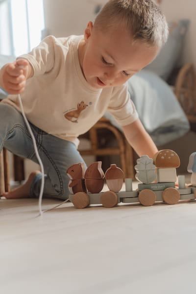 Pociąg zwierzątka Little Farm FSC od Little Dutch. Drewniany pociąg od Little Dutch z motywem z bohaterami kolekcji Little Farm. Dzięki klockom w różnych kształtach i kolorach można budować kurczaczki i pisklęta, dopasowywać klocki wedle koloru lub własnej wyobraźni. Pociąg składa się łącznie z 17 części i ma około 40 cm długości. Ta zabawka fantastycznie rozwija motorykę i jest również miłym dodatkiem do pokoju dziecięcego. Zabawka wykonana jest z drewna z certyfikatem FSC i pokryta farbami na bazie wody. Stanowi świetny pomysł na prezent i doskonałe uzupełnienie dla pozostałych zabawek z kolekcji Little Farm od Little Dutch.