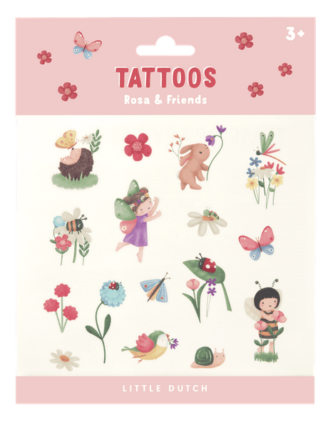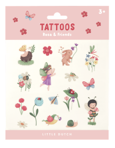 Tatuaże Rosa & friends od Little Dutch. Te urocze tatuaże wywołają uśmiech na twarzy każdego dziecka! Zestaw zawiera tymczasowe tatuaże z motywami Waszych ulubionych kolekcji od Little Dutch z ich uroczymi bohaterami oraz uroczą Rosą. Idealnie sprawdzą się jako zabawny dodatek na przyjęcie dla dzieci lub urodziny. Tatuaże są odpowiednie dla dzieci w wieku od 3 lat i są bezpieczne dla skóry dzieci. Łatwa aplikacja i zmywanie. Ten produkt świetnie sprawdzi się jako drobny upominek.