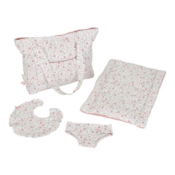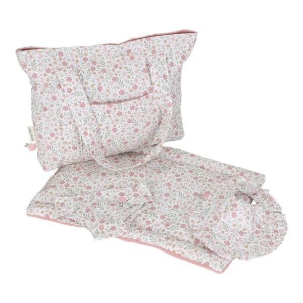 Praktyczny zestaw akcesoriów – w komplecie znajduje się torba, przewijak, pieluszka oraz apaszka w uroczym wzorze Soft Flowers.