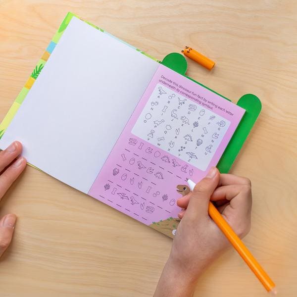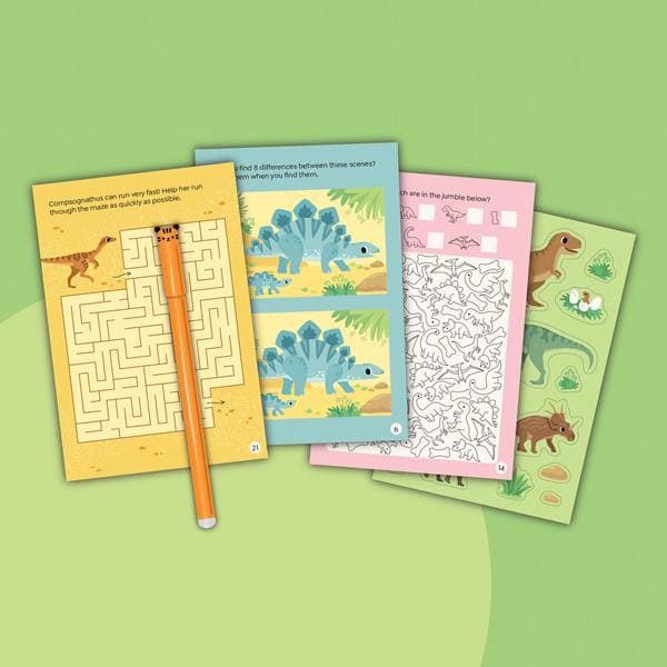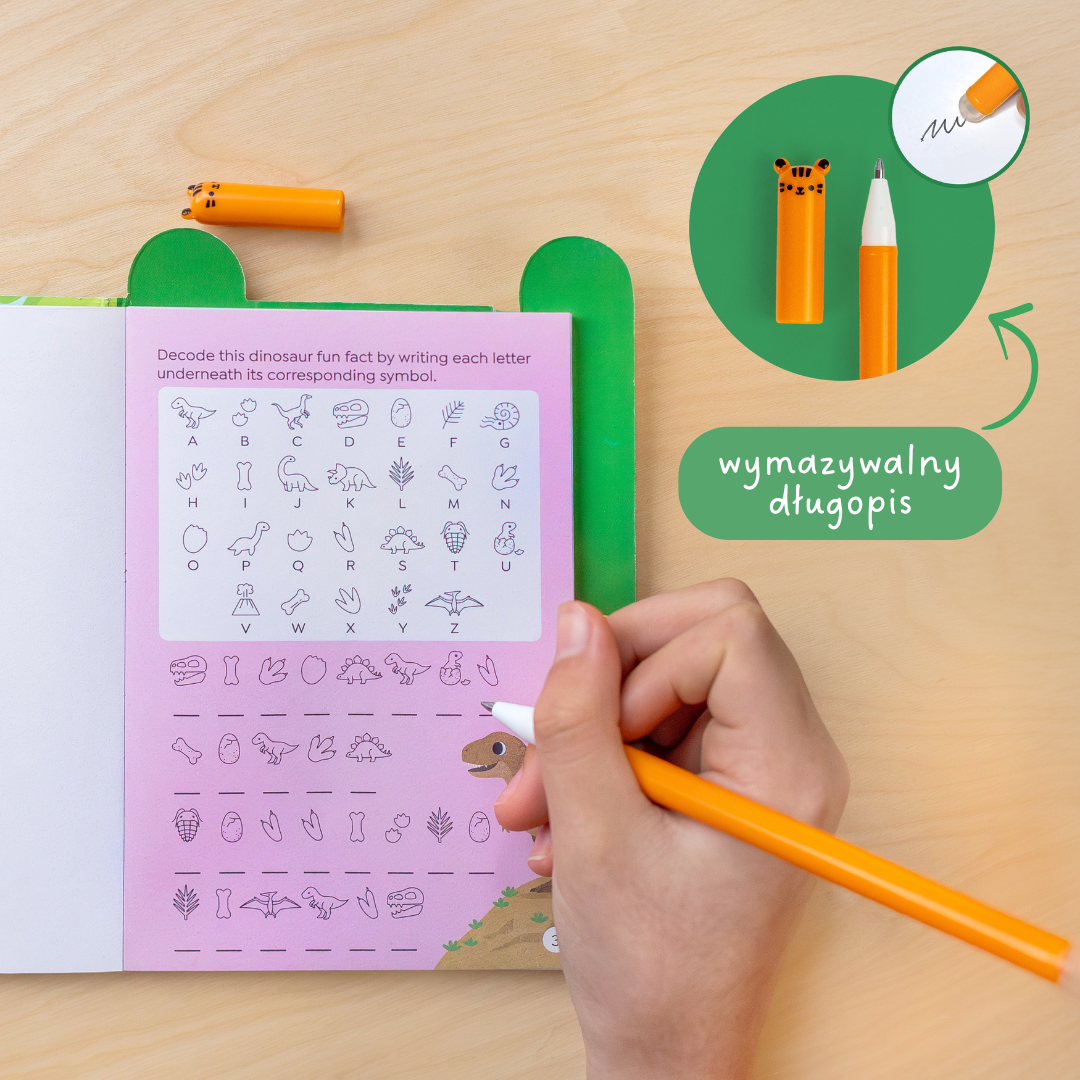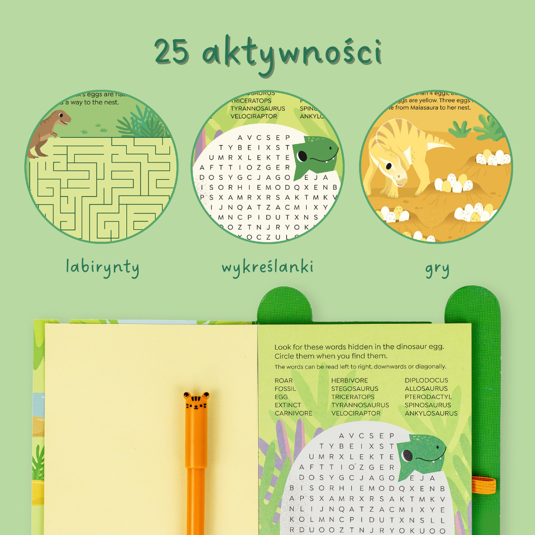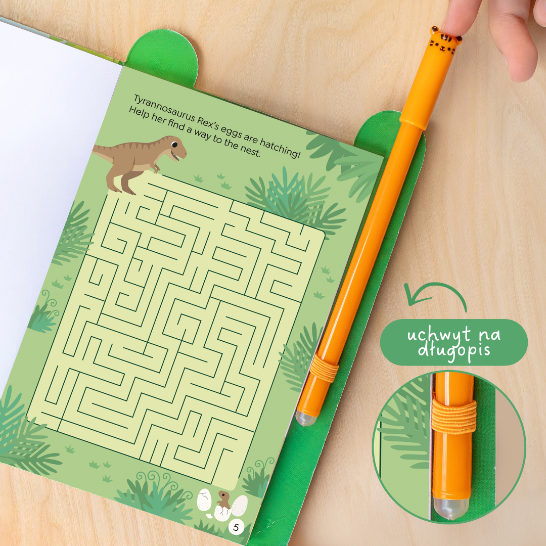 Zestaw aktywności z motywem w dinozaury to świetny sposób na wspieranie dziecięcej ciekawości i kreatywności. Maluchy ćwiczą spostrzegawczość, cierpliwość i zdolności manualne, jednocześnie świetnie się bawiąc. Dzięki poręcznemu formatowi i zmazywalnemu pisakowi możesz zabrać go wszędzie - w podróż samochodem, w samolot czy do poczekalni.