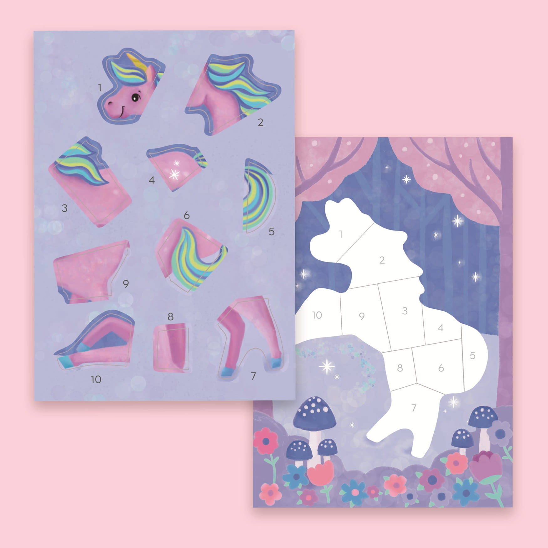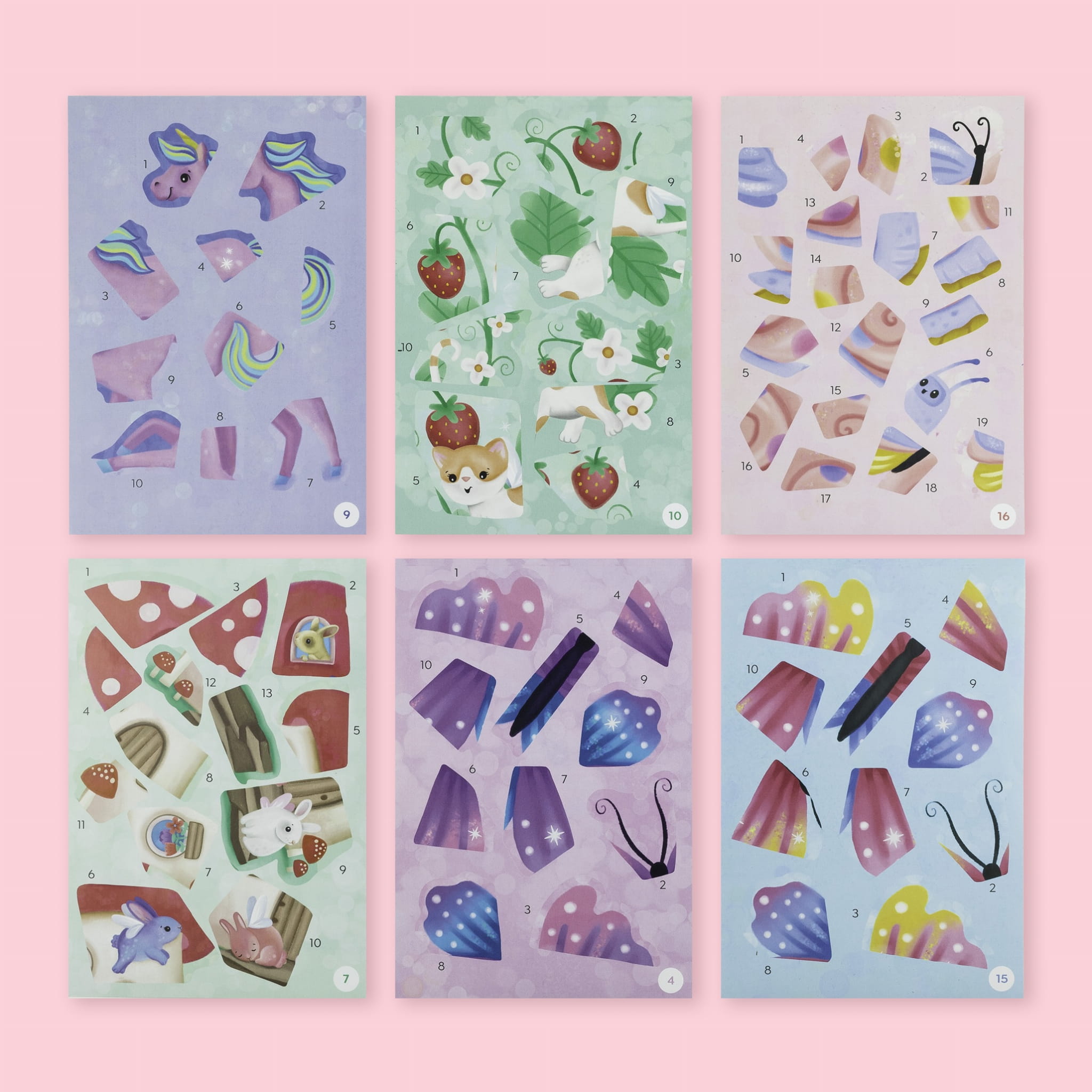 Skład zestawu: 16x ilustrowanych szablonów, 16 ponumerowanych arkuszy naklejek pasujących do szablonów, zabawne ilustracje o tematyce zaczarowanego ogrodu