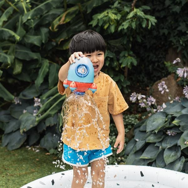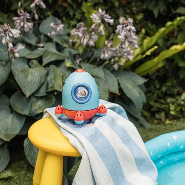 Zabawka Kąpielowa - Rakieta Kosmiczna od Tiger Tribe. Ta pływająca i wirująca rakieta do kąpieli zapewnia wciągające, interaktywne podróże wodne dla małych odkrywców podczas kąpieli! Dzieci pokochają efekty wodne – wystarczy zanurzyć rakietę pod wodą, aby ją napełnić, i cieszyć się kaskadą wody, gdy dysze wirują, tworząc zabawny kształt kopuły. Świetny sposób na wprowadzenie zabawy sensorycznej do kąpieli. Rakieta Kosmiczna zachęca dzieci do zmoczenia włosków i oswajania się z uczuciem wody lejącej się po ich głowach. Ten produkt jest częścią serii ECO, stworzonej z bioplastiku.