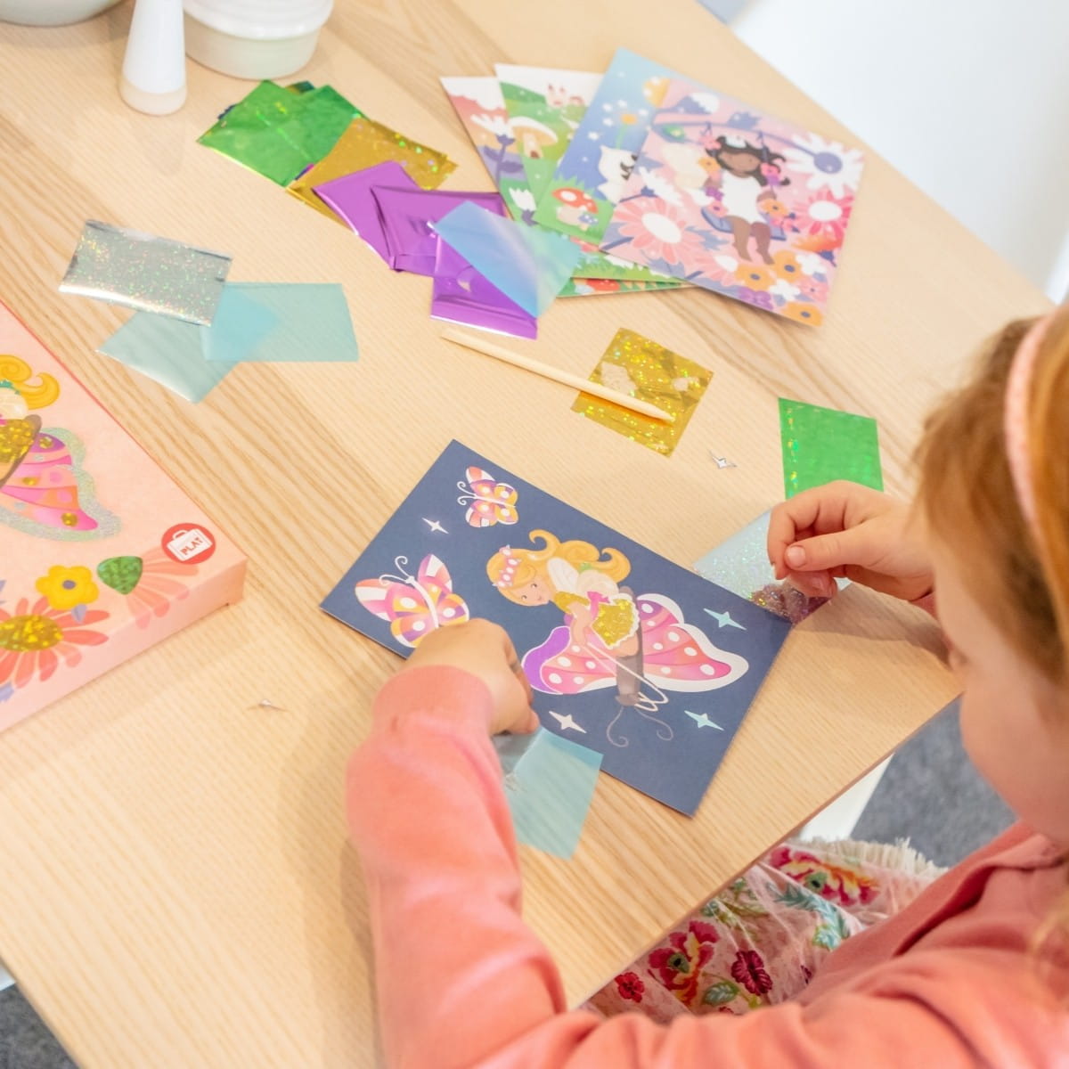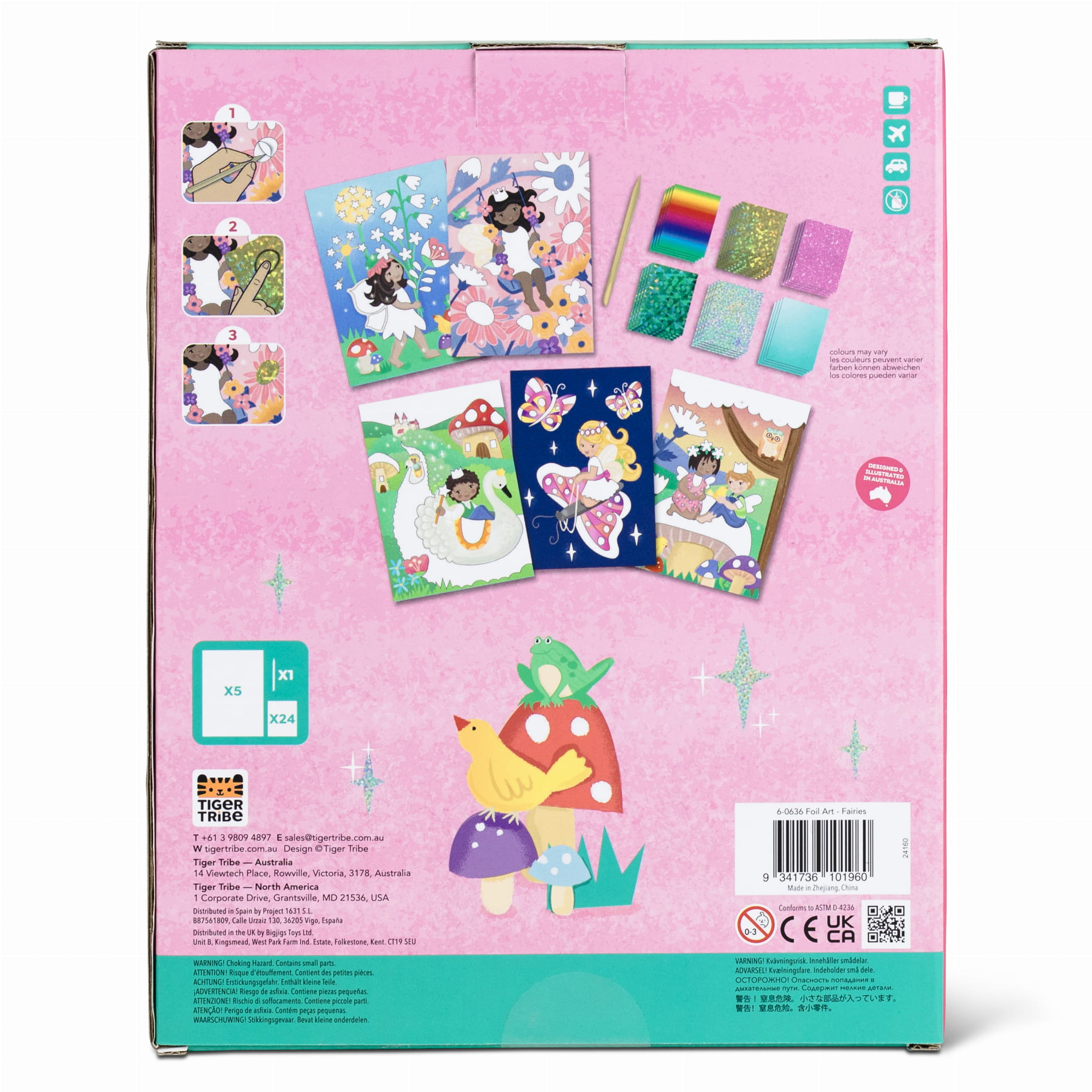 Zestaw Artystyczny z Folią - Wróżki od Tiger Tribe. Skrzydła motyla, płatki kwiatów i korony wróżek czekają, aż ożyją dzięki błyszczącej folii holograficznej. Wystarczy wybrać ilustrowaną kartę i za pomocą dołączonego drewnianego patyczka odkleić białe sekcje od obrazka, odsłaniając sekcje z klejem. Następnie na klejące miejsca wystarczy nałożyć folię i piękny, mieniący się obrazek gotowy! Zestaw dla aspirujących artystów. Trenuje precyzję i pozwala tworzyć obrazki, które z powodzeniem ozdobią ściany w dziecięcym pokoju.